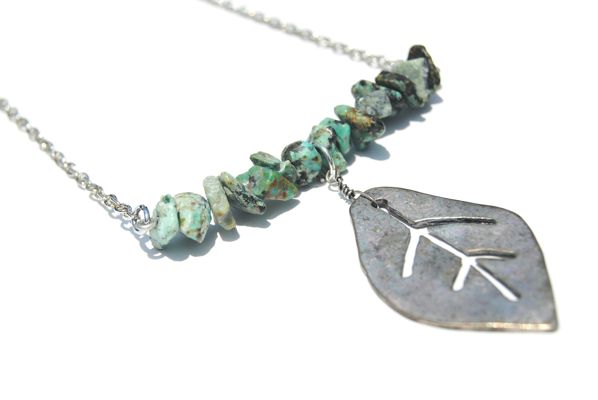 A vintage leaf charm hangs between African turquoise stone chips. Features a 24-26 inch silver plated chain and a lobster clasp closure.