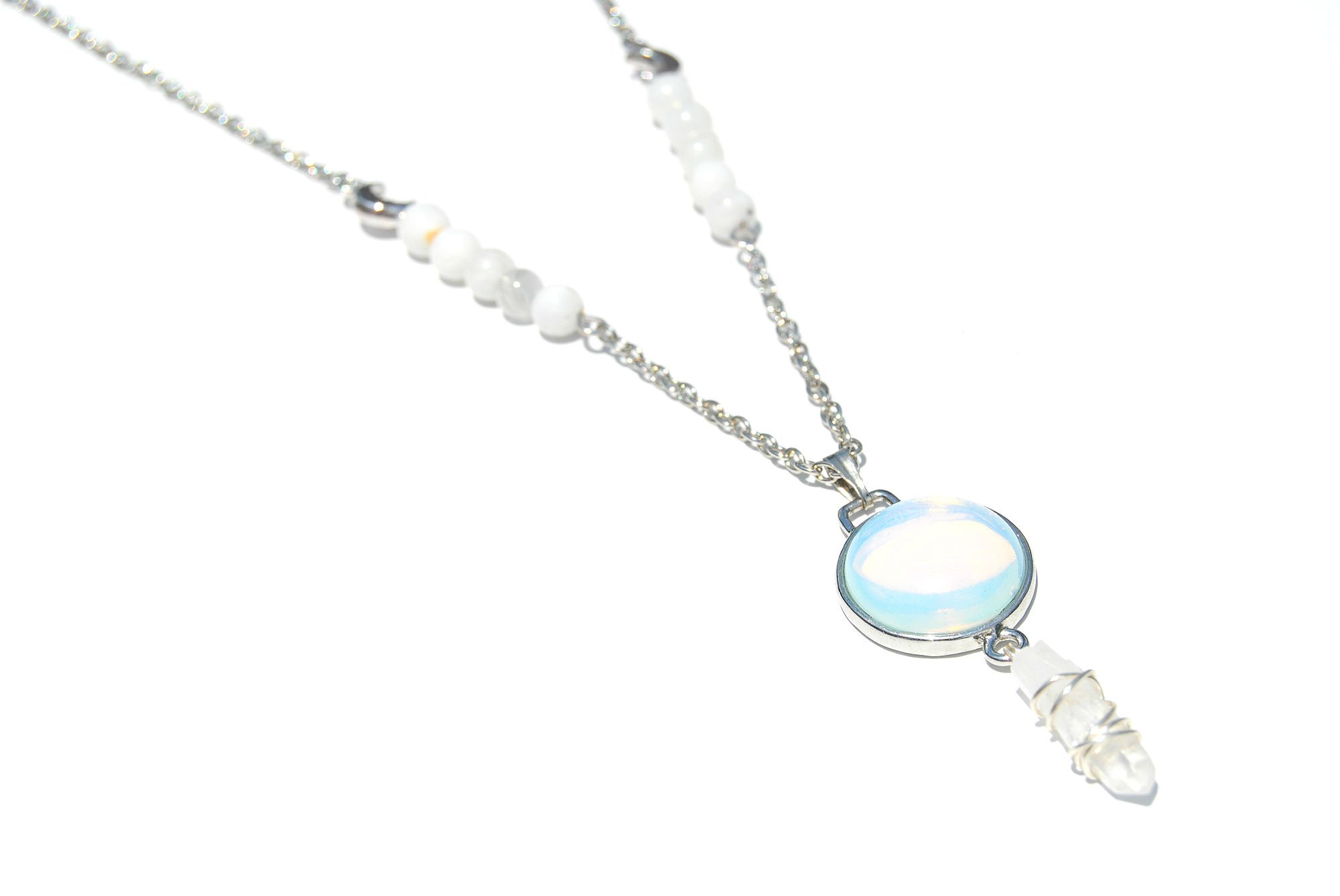 A mini quartz crystal point is wire wrapped and hung beneath an opalite cab round. Features 10 mini moonstone beads and two silver moon charms. On a 26 inch long silver plated chain. Lobster clasp closure.