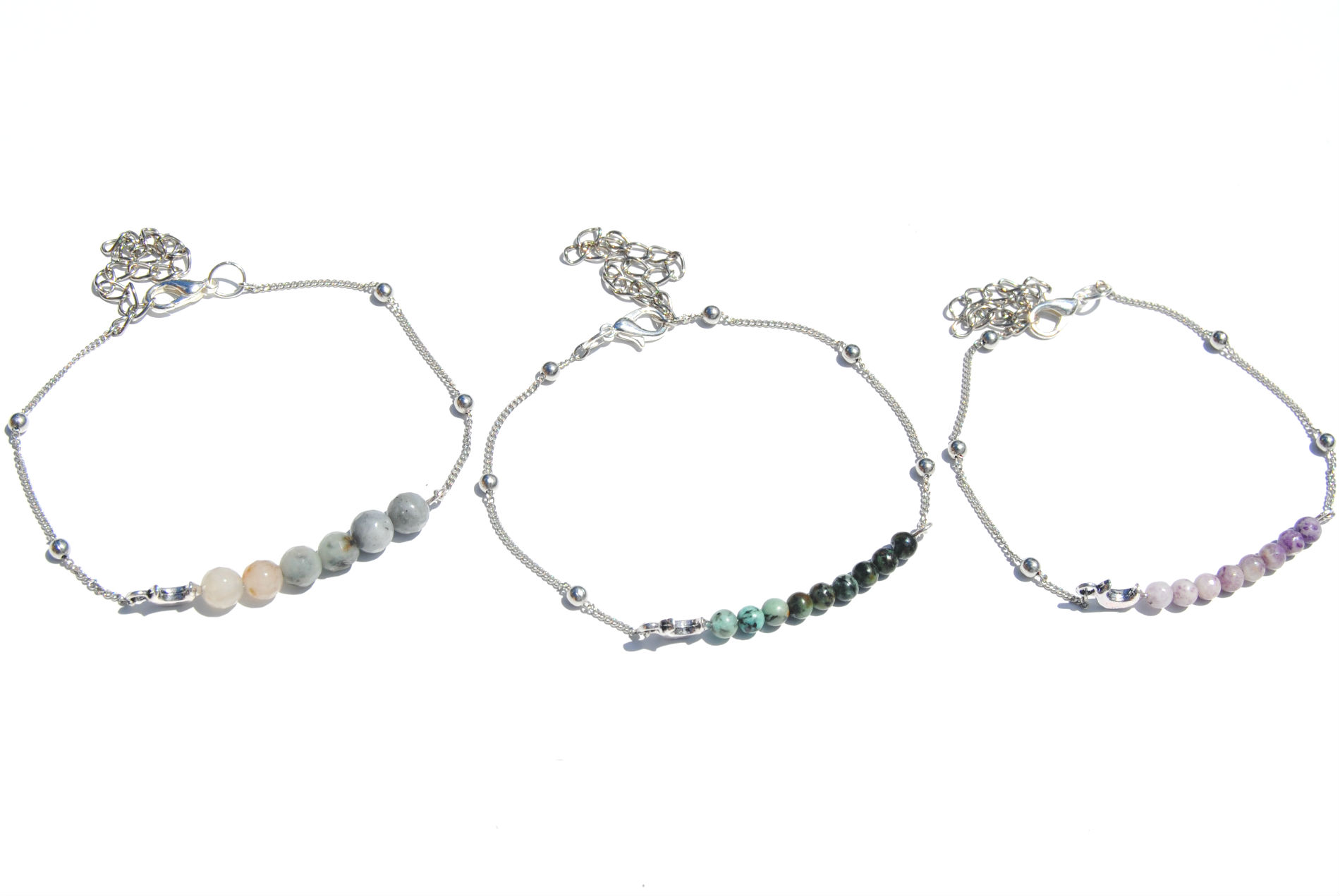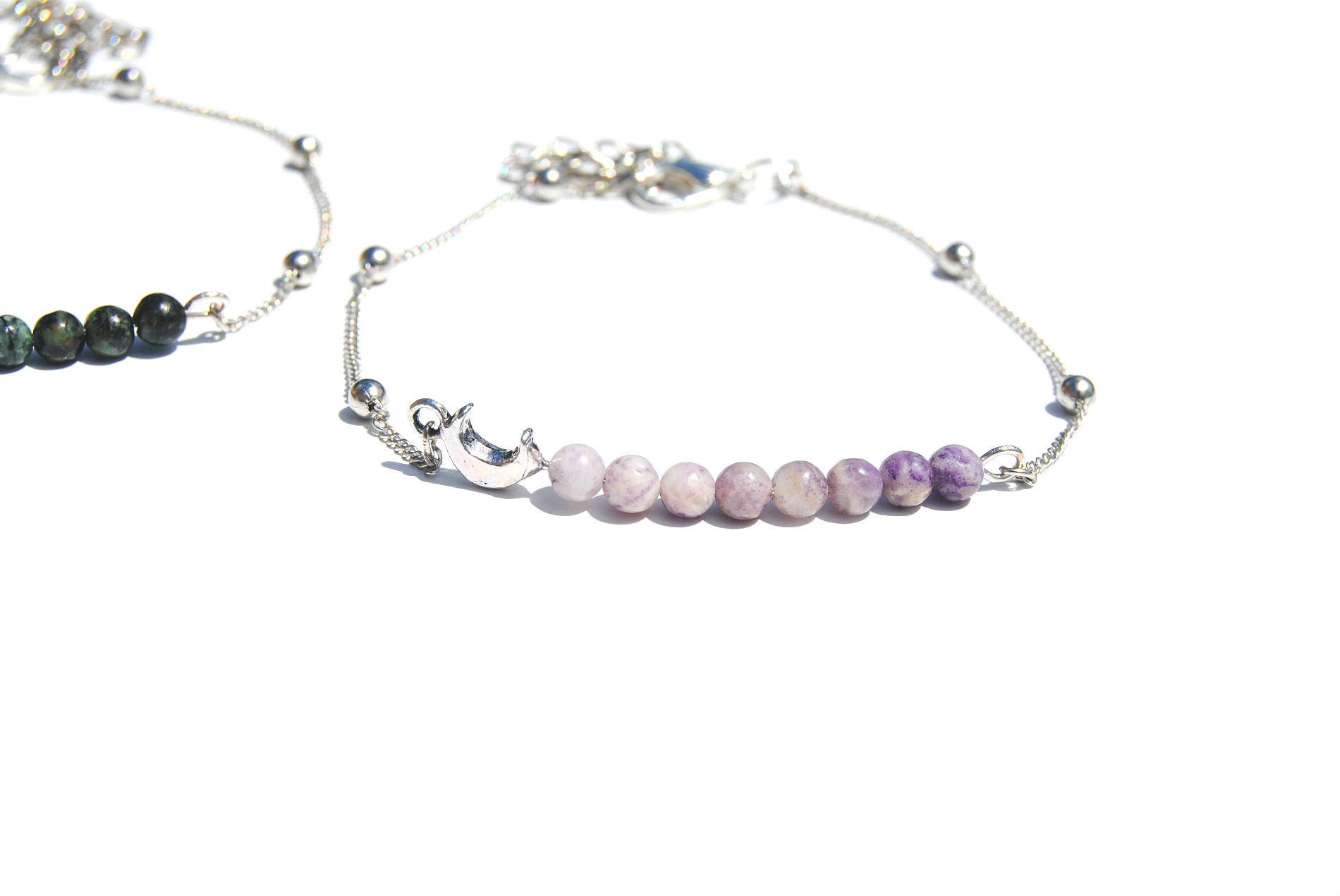 These bracelets (or anklets) feature meticulously selected shades of African turquoise, jade, and amethyst mini beads. Each one features a mini moon charm, a 2.5 inch extender chain, and lobster clasp closure. All silver plated and measure 8 inches in length.