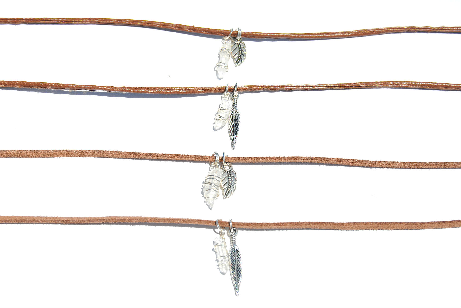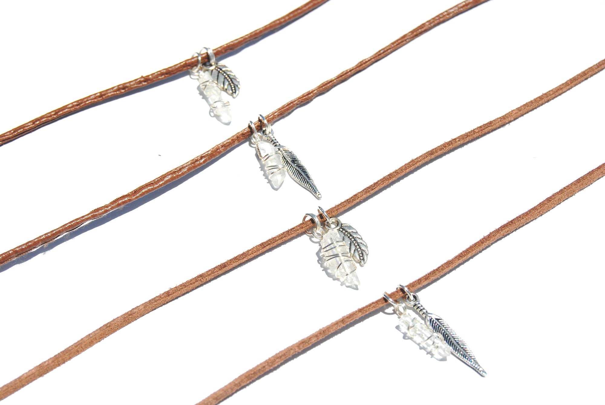Tiny quartz crystals are carefully wire-wrapped and hung on a brown faux leather/suede cord. Features silver plated lobster clasp closures and a mini charm. Measures 11.75-14.25 inches in length.